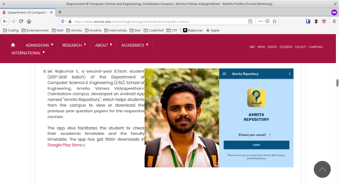 It started off as a Python CLI application providing access to only question papers which later extended itself to an android app and a telegram bot with much more helpful features. The suite of apps aim at helping students of Amrita Vishwa Vidyapeetham to find all the materials pertaining to their curriculum of study under one portal with an easy to use interface. It has features including access to previous year question papers, student/faculty timetable, examination schedules, curriculum for various courses, attendance, grades, course resources uploaded by the faculty and latest news regarding the campus. The app has received 8000+ downloads in Play Store as on date, an appreciation letter from the Dean of Engineering, an average of ~4000 monthly active users and great responses from all the students as well as faculty.